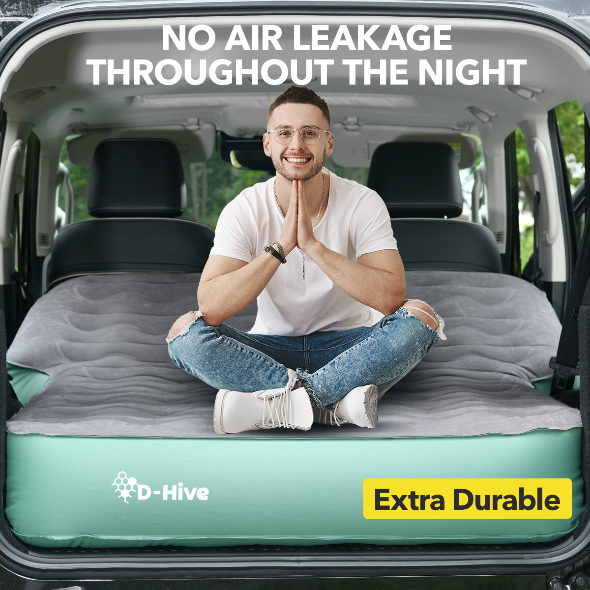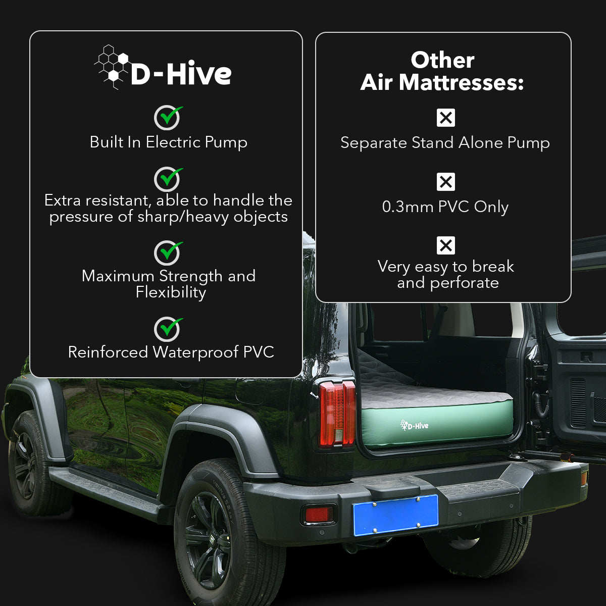 AIR-TIGHT: Every one of our car mattresses undergoes rigorous testing for a minimum of 72 hours to detect any potential air leakage. Rest assured that D-hive offers a meticulously tested mattress, ensuring uninterrupted nights of sleep without any unexpected air leaks. Proven to have at least 30% less air leakage than common car mattresses.